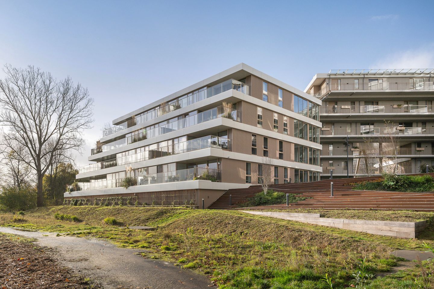 On the former location of riding school De Prinsenmolen stands the iconic residential building Prinsenpark, a modern complex with terraced balconies cascading down the facade and a secured parking garage.