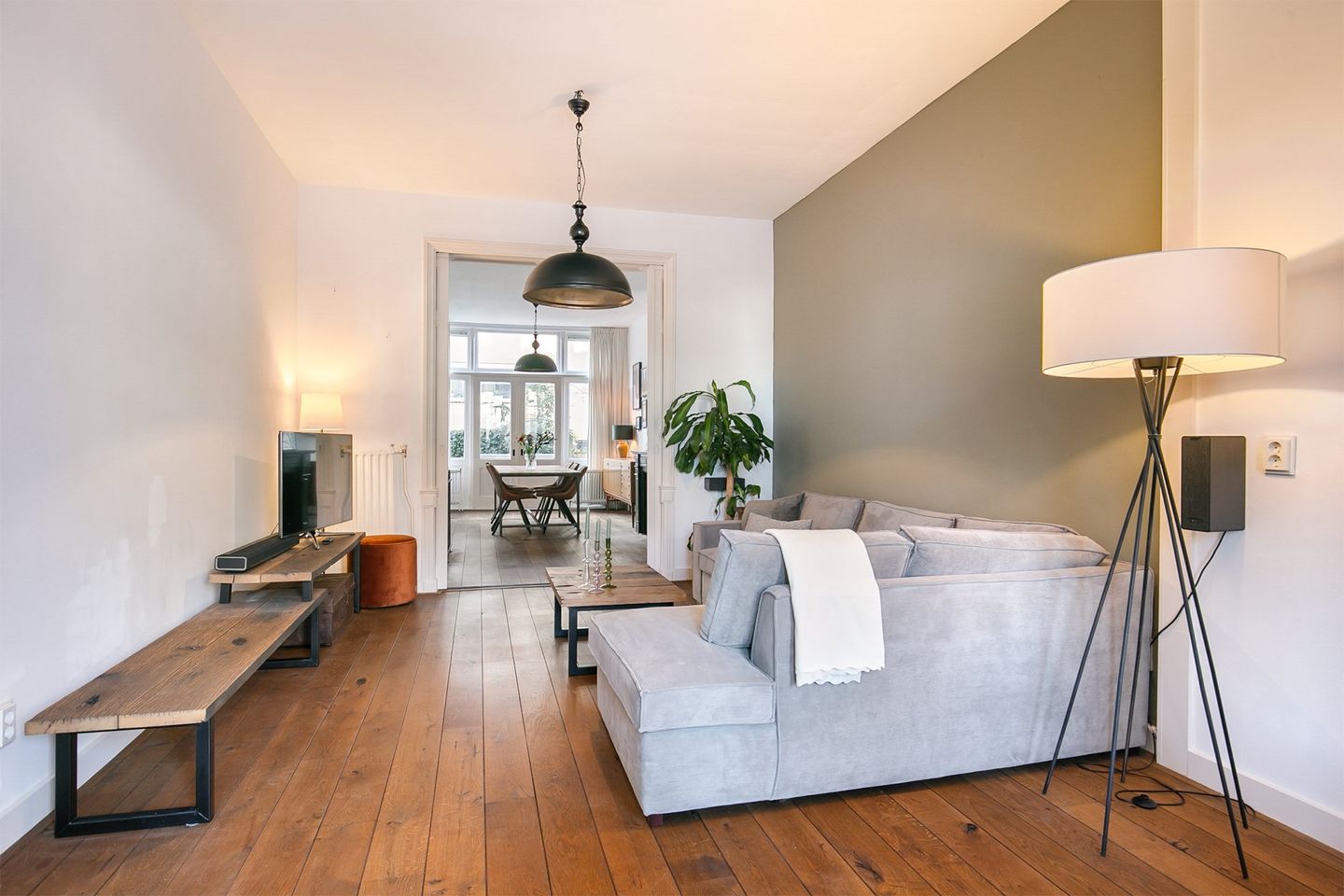 Entrance apartment on the ground floor in hall. The hall offers enough space for coats and shoes and gives access to the toilet. The spacious and bright living room is accessible from the hall. This space can be separated into a separate sitting and dining area through authentic sliding doors. The sitting area is furnished with a nice corner sofa with coffee table and TV furniture and the dining area has a spacious dining table with six chairs.