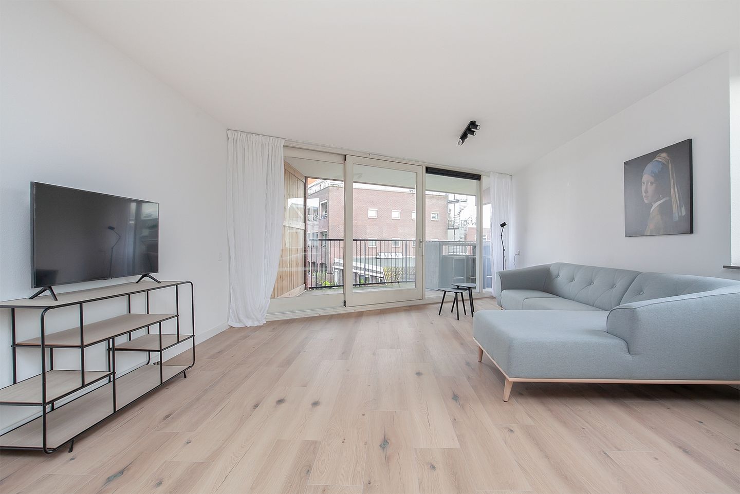 The living room has a lot of natural light through the large windows. These windows are sliding doors that give access to the large balcony. The living room itself has enough space for a corner sofa, coffee table and a television. The open kitchen is equipped with a refrigerator, freezer, dishwasher, oven and induction hob with extractor hood. adjacent to the kitchen you can place another large dining table.