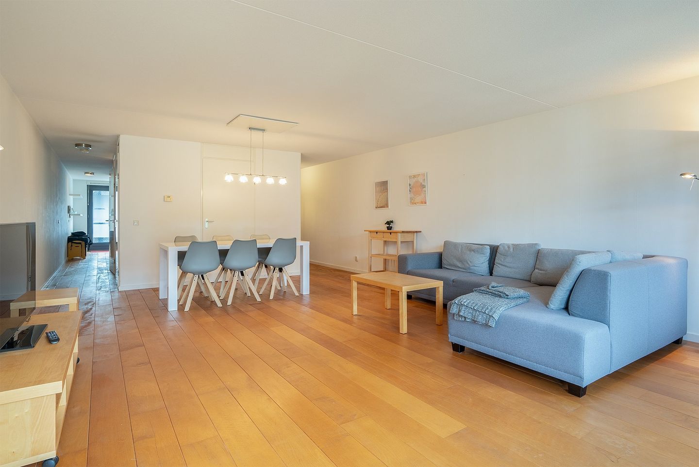 De ruime en lichte woonkamer is gelegen aan de zijkant van het gebouw en vanaf het ruime en zonnige balkon is er een leuk en rustig uitzicht op de tuintjes van de buren.