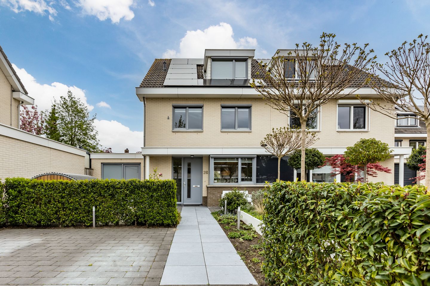 Voortuin, v.v. sierbestrating, plantenborders, dubbele privé oprit en overdekte fietsenstalling.