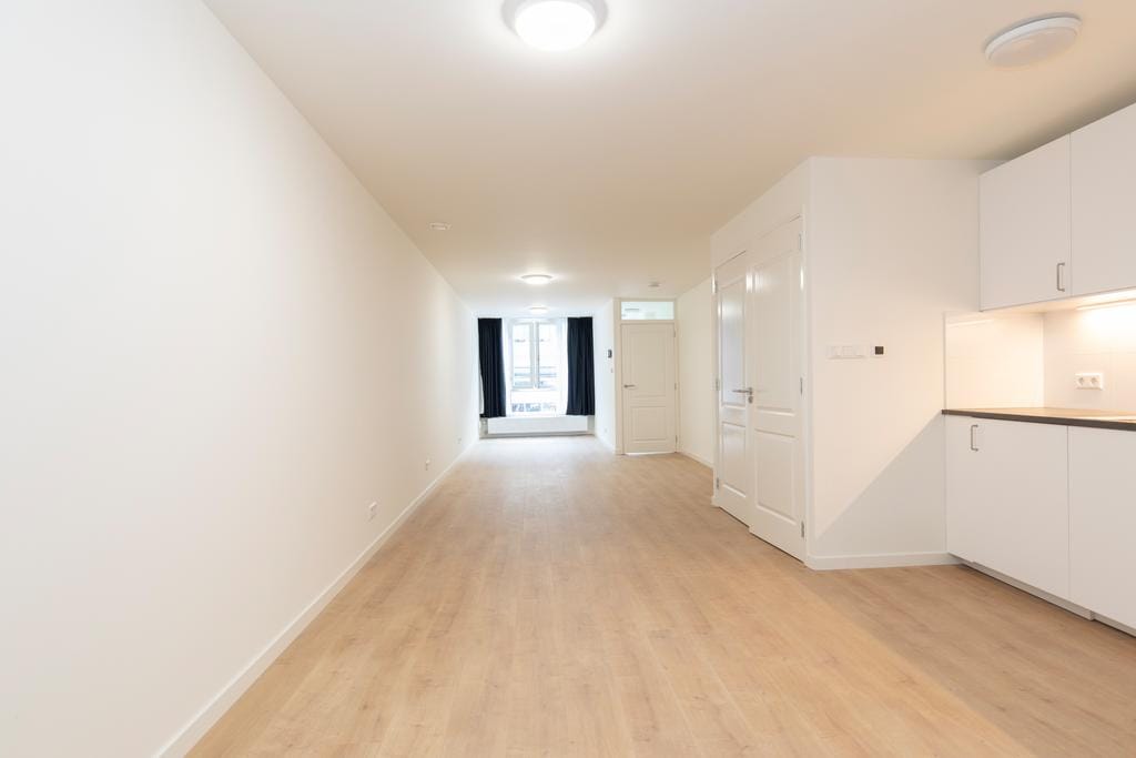 Modern and good sized 1 room apartment located on the bel etage floor in the middle of the Pijp on a pleasant part of the Albert Cuypstraat. This unfurnished studio apartment is equipped with a beautiful laminated floor, fully equipped open kitchen, modern bathroom, private entrance, separate toilet, curtains, light fixtures and all brand new!