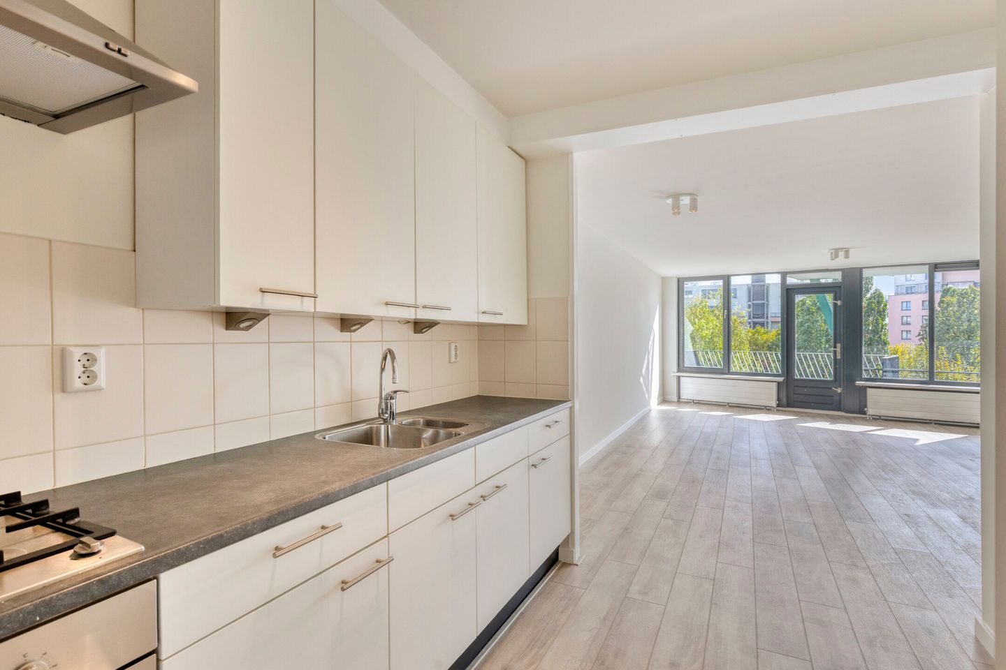 De ruime woonkamer wordt prachtig verlicht door het vele daglicht en biedt direct toegang tot het balkon – perfect voor een kop koffie in de ochtend of een borrel met vrienden in de avond. De keuken is goed onderhouden en functioneel, voorzien van een oven, gasfornuis met ingebouwde afzuiging en voldoende opbergruimte.