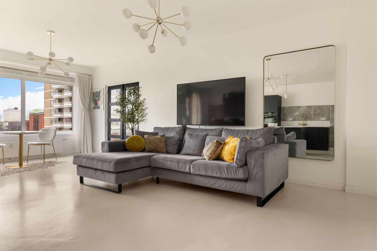 Welcome to this bright, modernly decorated apartment, where you are greeted by an open-plan living area with direct access to a large balcony, offering beautiful views of the city skyline. The apartment is fully furnished and comes with a private underground parking space. The large kitchen island, complete with tall bar stools, is perfect for casual dining and entertaining. The kitchen is fully equipped with contemporary appliances, including an induction hob, oven, full-size fridge, and dishwasher.