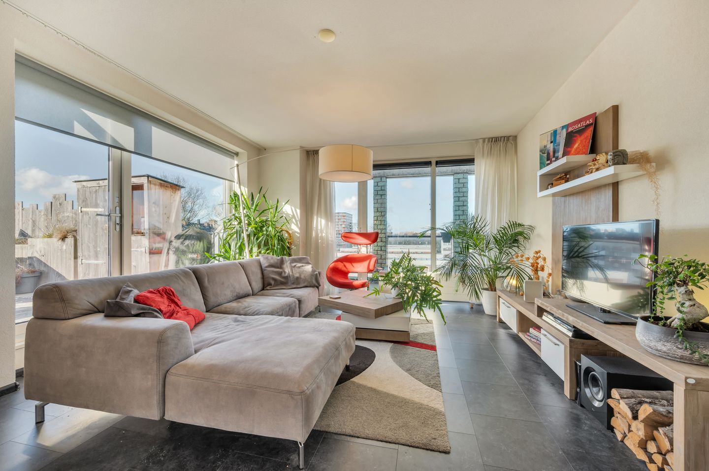 De woonkamer is zeer licht dankzij de grote raampartijen met toegang tot het balkon en het dakterras.