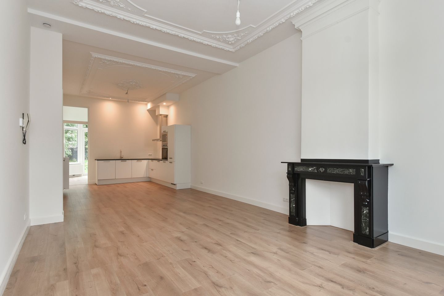 Completely luxuriously renovated 3-room ground floor apartment with a stunningly spacious garden of approximately 300m² – a truly unique offering! Situated behind a monumental façade, the property features a generous living area with a modern open-plan kitchen equipped with high-end appliances, a stylish bathroom finished with sustainable materials, and two well-proportioned bedrooms. The expansive garden is northwest-facing. The apartment has been fully renovated using high-quality materials, carefully selected color schemes, and full insulation, resulting in an energy label A!