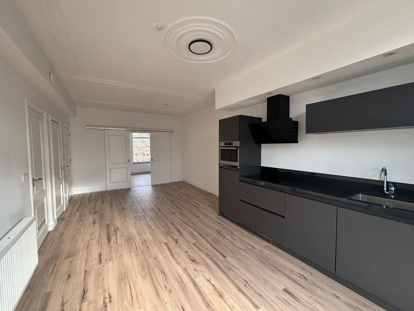 Dankzij de royale indeling, het lichte interieur en de karakteristieke details voelt het appartement licht, ruim en warm aan.