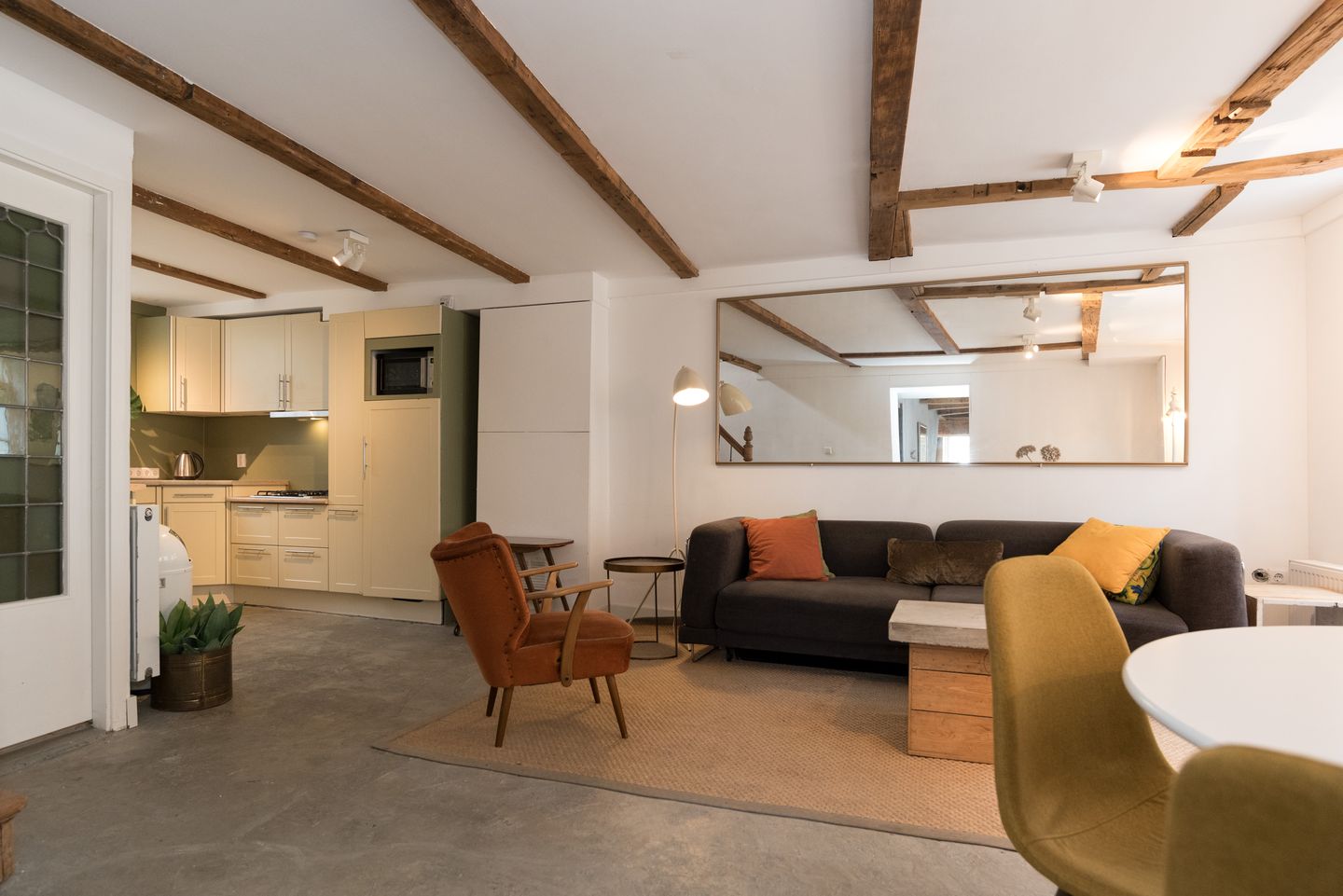 Upon entering the apartment, you immediately notice the bright sitting area at the front, with beautiful views over the canal. This space, equipped with large windows, is perfect for a reading corner, home office or just a quiet place to enjoy the surroundings. Adjacent is a compact kitchenette, ideal for everyday things. Further back, the house opens up into a generous living room with large open-plan kitchen, where there is more than enough room for a cosy dining area and comfortable seating area. The atmosphere is warm, authentic yet contemporary. There are also two bathrooms on the ground floor: one with a bath, washbasin and toilet, and a second with a shower.