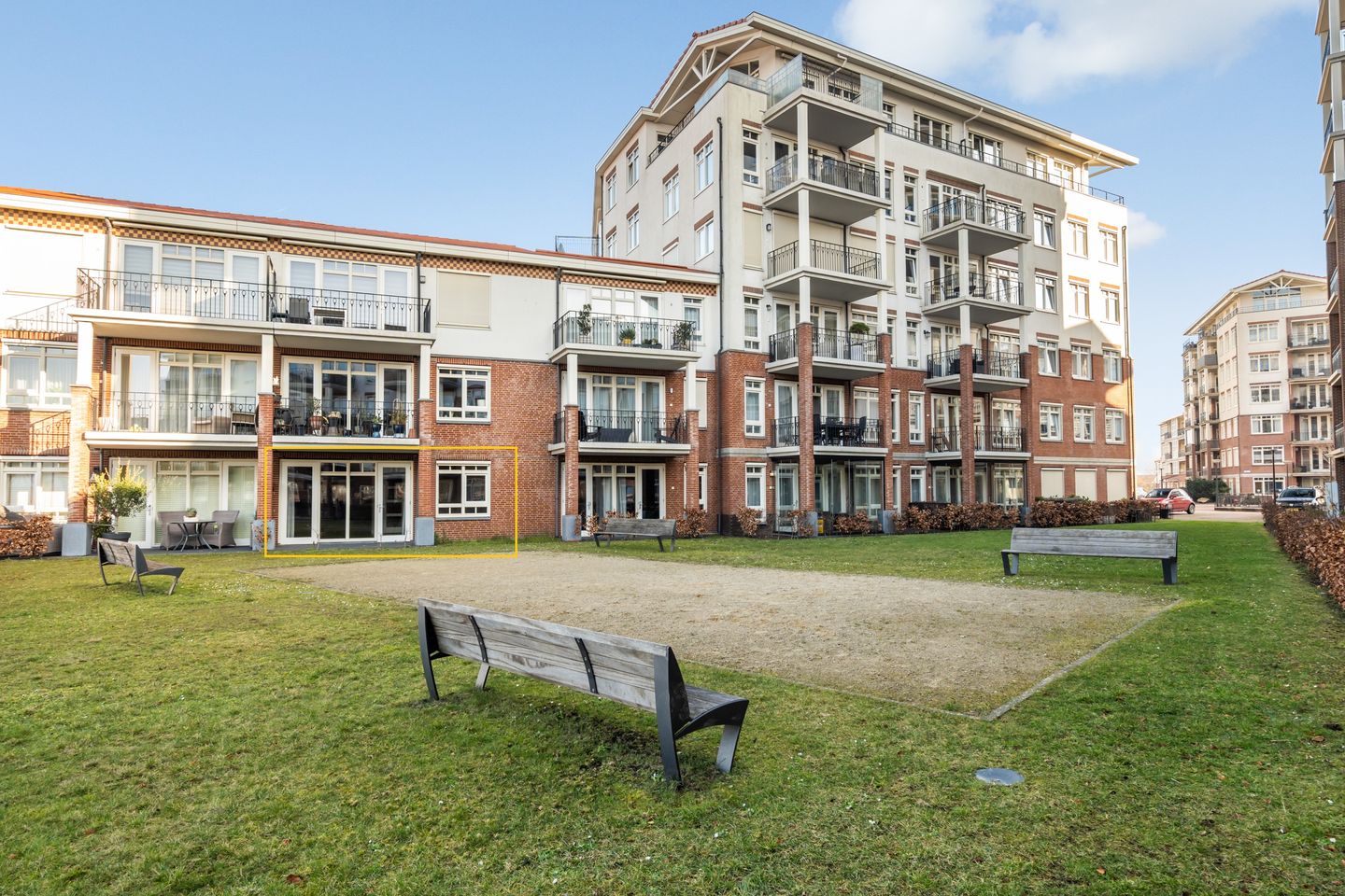 Het appartement is gelegen aan de binnentuin, een sfeervolle binnenruimte die perfect dient als ontmoetingsplek voor de bewoners. Aan de andere zijde van de woning bevindt zich een zonnig terras op het zuiden, dat uitkijkt op een jeu de boules baan, waardoor u kunt genieten van gezelligheid en sociale interactie op de baan.