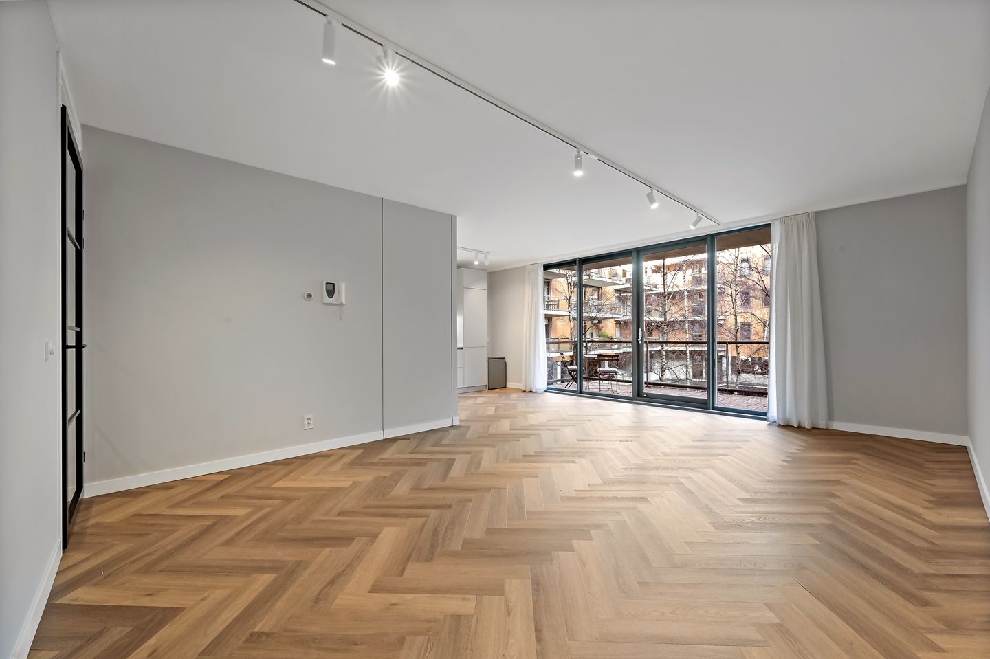 Entering the apartment on the second floor, you step into a spacious hallway that connects all rooms. At the end of the hallway, you’ll find the bright and airy living room, where large glass sliding doors let in plenty of natural light. The living area is perfect for relaxing, with space for a large couch and TV.