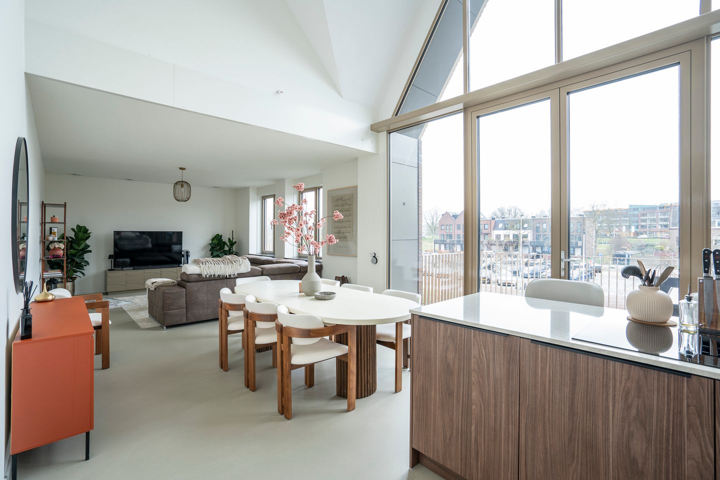 Als we de hal doorlopen komen we uit in de ruime woonkamer en keuken. De grote raampartijen zorgen voor veel lichtinval en de vide versterkt het gevoel van ruimte. Wat een gave plek! Vanuit de woonkamer is er toegang tot het ruime balkon op het oosten (waterzijde) middels dubbel openslaande deuren. De keuken is voorzien van een hoekopstelling en een mooi kookeiland. De keuken wordt geleverd inclusief keukenapparatuur van het merk Siemens met onder andere een inductiekookplaat met afzuiging, koel-/vriescombinatie, combi oven en een vaatwasser. Het aanrechtblad wordt uitgevoerd in composiet en is voorzien van een RVS spoelbak.