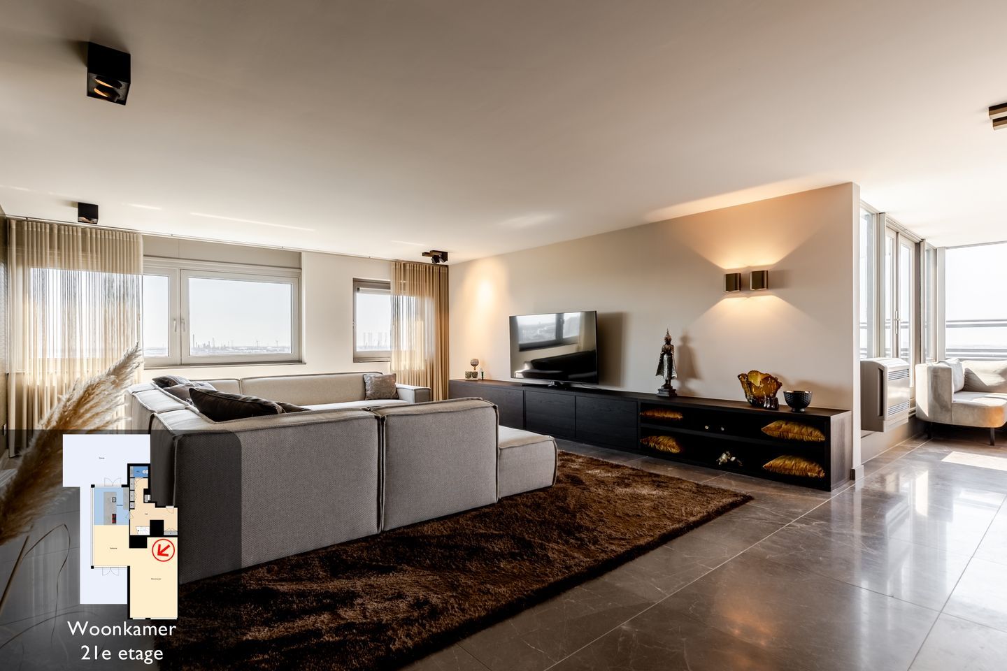 Upon entry on the twenty-first floor, you are greeted by a refined hallway featuring custom-built cabinets with integrated lighting and tall doors that emphasize the height and openness of the space. A designer steel pivot door by Gewoon Gers opens into the expansive living area, where a natural stone floor sets a tone of elegance and understated luxury. The living room includes an LG television that will remain in the property and provides direct access to a stunning rooftop terrace with panoramic views over Vlaardingen and beyond.