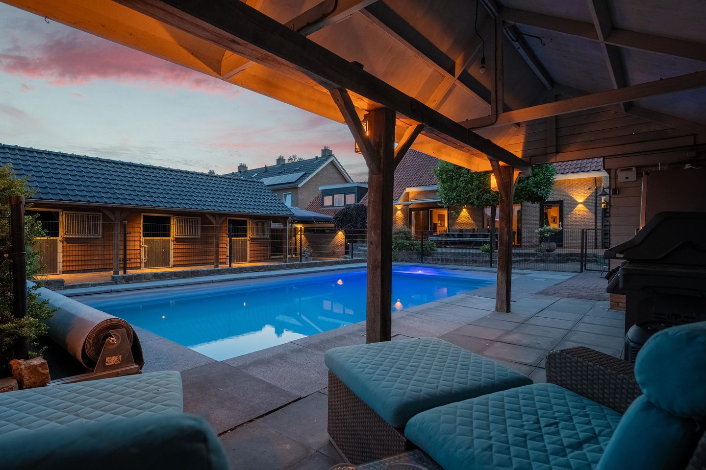 De buitenruimte vormt een belangrijk onderdeel van deze woning en biedt een prettige combinatie van rust, ruimte en het houden van paarden aan huis. Vanuit de woonkamer heeft u direct toegang tot het royale perceel, waar de tuin en het paardenaccommodatiegedeelte overzichtelijk en praktisch zijn ingericht. Het paardenaccommodatiegedeelte is direct bereikbaar vanaf de woning en beschikt over alle voorzieningen voor comfortabel en efficiënt gebruik. De rijbak van circa 800 m² met professionele eb- en vloedbodem maakt trainen onder vrijwel alle weersomstandigheden mogelijk. In combinatie met de stapmolen, stallen, paddocks en weides zijn de faciliteiten geschikt voor dagelijks gebruik en optimale verzorging van de paarden. De aanwezigheid van een wasplaats, binnenpoetsplaats en zadelkamer benadrukt het complete karakter van de accommodatie. Daarnaast biedt de tuin volop ruimte voor ontspanning. Het recent aangelegde zwembad vormt een fijne plek om te genieten van het buitenleven, terwijl meerdere zitplekken zorgen voor mogelijkheden in zowel zon als schaduw. De ruime oprit biedt parkeergelegenheid voor meerdere auto’s en trailers en via de achterzijde is het perceel eveneens goed bereikbaar.