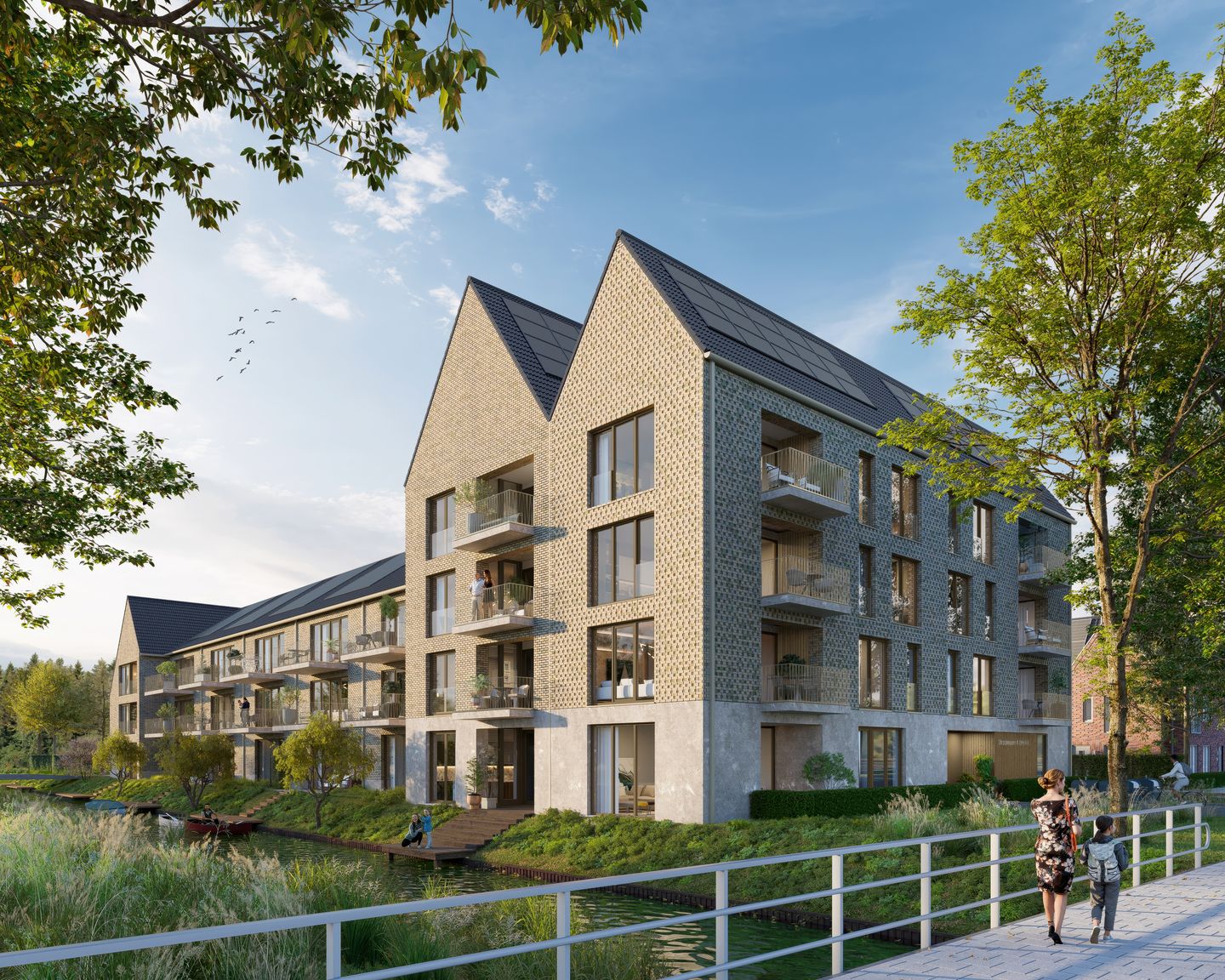 Buitenveen Aalsmeer is klaar voor de toekomst. Niet alleen de woningen zelf zijn energiezuinig, duurzaam en gasloos, ook de wijk wordt volledig klimaatbestendig ingericht. Door de vele groene zones, parken, wadi’s, watergangen en – bergingen en natuurspeelplekken is Buitenveen niet alleen bestand tegen hevige hoosbuien, maar wordt het water ook vastgehouden voor drogere periodes. Natuurlijke, weelderig groene oevers bevorderen de waterkwaliteit en zijn goed voor de biodiversiteit. Om opwarming van de omgeving tegen te gaan is verhard wegdek in de openbare ruimte geminimaliseerd. Waar verder nog verharding nodig is, wordt het half-open, zodat er gras tussen kan groeien. Het gevarieerde groen en de vele, verschillende soorten bomen zorgen voor verkoeling, schaduw en een gezonde woonomgeving voor mens én dier. En, kijk omhoog! Ook aan de gevels en op de daken komt groen! En heb je een elektrische auto, dan laad je die op aan één van de vele laadpalen die in de wijk komen te staan.