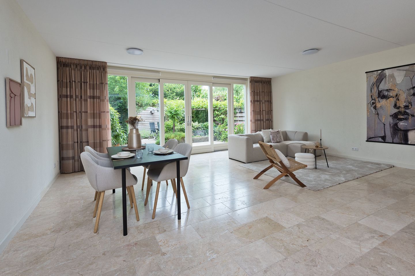 De hoofdentree, geschikt voor bezoek, bevindt zich op de eerste verdieping. Dit biedt mogelijkheden voor een praktijk of kantoor aan huis. Vanuit hier leidt het lichte trappenhuis je naar de begane grond, het woongedeelte. Hier bevindt zich de dagelijkse entree, een separaat toilet, de meterkast en de toegang tot de ruime, tuingerichte woonkamer met open keuken. De keuken is netjes onderhouden en beschikt over een teakhouten werkblad, vaatwasser, anderhalve spoelbak en een 4-pits gaskookplaat met recirculatiekap. Een apart blok biedt ruimte voor de koelkast met vriezer en de oven. De gehele begane grond is voorzien van marmeren plavuizen met vloerverwarming.
