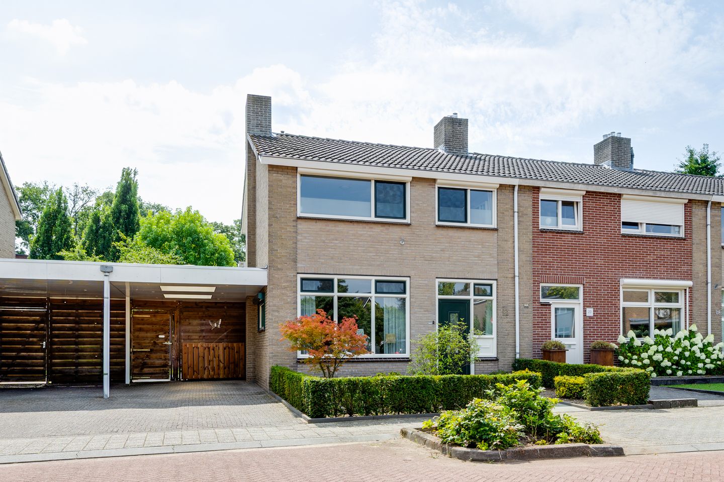 We beginnen bij de voortuin. Deze is strak aangelegd en goed onderhouden. Maar zoals gezegd zit de verrassing hier aan de achterzijde. Eerst even iets praktisch; via de poort in de carport, cross je hier de fietsen gemakkelijk onder de overkapping in de fietsenstalling