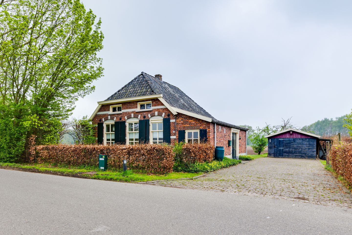 Verder vallen de luiken aan de buitenzijde positief op. Er is een buitenkraan en grotendeels dubbel glas en dakisolatie toegepast. De cv-combiketel dateert uit 1998. Op de oprit kunnen meerdere auto’s. De schuur is al 55 jaar oud en dat kun je zien. Rondom is de tuin die hoofdzakelijk uit gras bestaat. Het aanpalende agrarische stuk wordt door de boer afwisselend gebruikt als grasland, verbouw van mais en aardappels.
