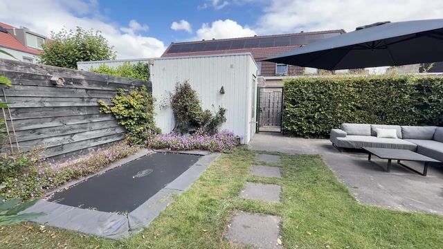 Aan de zijkant van de woning is plek voor twee auto’s, met mogelijkheid tot afsluiting met een laag hek. Een eigen laadpaal is aanwezig. De achtertuin is modern aangelegd met grote grijze tegels, gras, een pergola, zonneterras en een ingegraven trampoline voor de kinderen. De tuin is volledig omheind met een fraaie rode stenen muur en hekwerk, wat veel privacy biedt.
