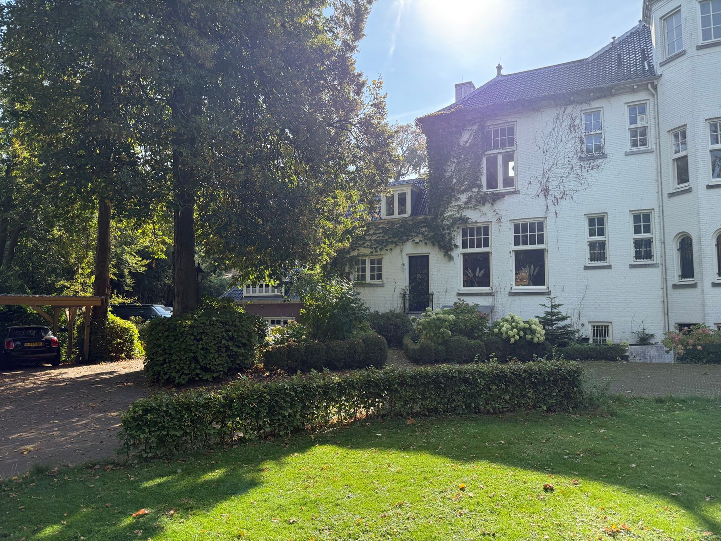De grote, hoge ramen geven een prachtige lichtinval en veel zon in huis. Vanuit alle vertrekken is er zicht op de grote tuin en de mooie bomen. Ook de vele bijzondere details w.o. de monumentale ingemetselde gevelstenen, het houtsnijwerk en diverse andere authentieke elementen dragen bij aan de unieke uitstraling van dit royale familiehuis. Aan de voorkant van het huis loopt een hoefijzervormige mandelige oprijlaan met carport (prive) en parkeergelegenheid voor meerdere auto’s.
