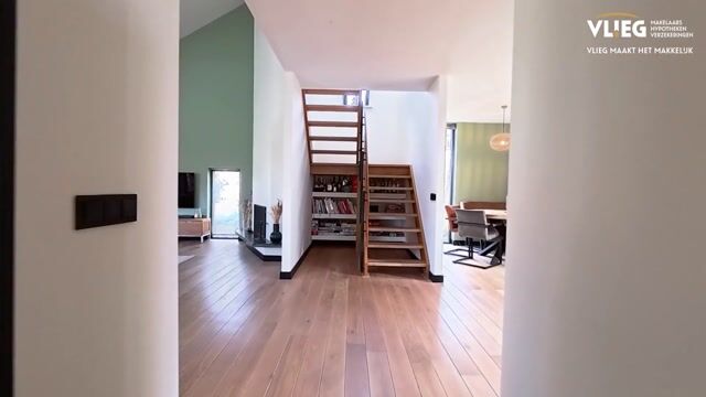 The expansive living room extends across the full depth of the house and benefits from abundant natural light through large windows. The striking high ceiling enhances the sense of space, while the fireplace adds warmth and atmosphere. The room is finished with a beautiful wooden floor and a large sliding door provides access to the garden.