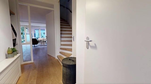 Entree: Je komt de woning binnen in een fijne hal. Dankzij de handige droogloopmat zie je hier geen vieze voetafdrukken. Vanuit de hal is er toegang tot de toiletruimte, meterkast, trapopgang naar de eerste verdieping en de woonkamer. De trap is in 2023 mooi gerenoveerd, samen met de plinten. De hal is afgewerkt met gestuukte wanden en een gestuukt plafond. Op de vloer ligt een nette PVC-vloer die over de gehele begane grond doorloopt.