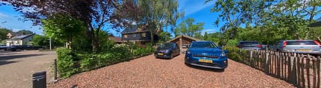De achtertuin biedt veel privacy en is groen aangelegd met diverse planten, bloemen en bomen. Er is een overkapping aanwezig voor beschutte zitplekken. Daarnaast zijn er praktische voorzieningen zoals een vrijstaande garage, vrijstaande schuur, maar ook een kippenhok en plantenkas. De oprit biedt parkeergelegenheid voor meerdere auto’s.