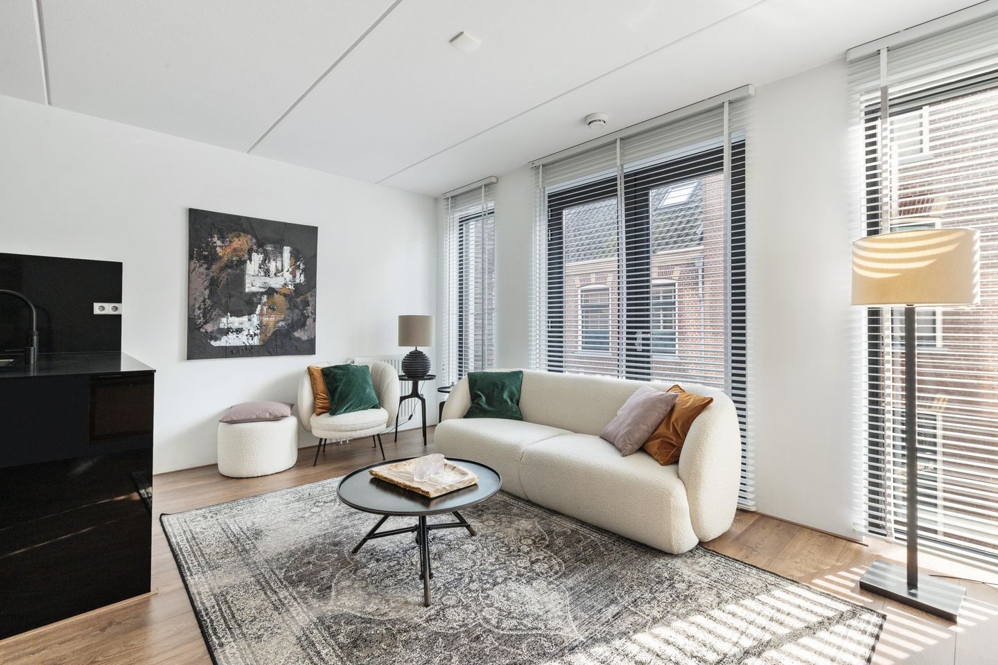 De woonkamer met open keuken bevindt zich aan de kant van de Baanstraat, met uitzicht naar vele prachtige panden. Met ramen tot vloerhoogte wordt de ruimte in de woonkamer geaccentueerd en het Frans balkon met openslaande deuren verbindt binnen met buiten. Voor een kookliefhebber is de keuken, met inbouwapparatuur, een pluspunt. Het aanrechtblad, het zijpaneel en de achterwand zijn van zwart composiet en de gaskookplaat, afzuigkap, vaatwasser, combi-oven en koelkast zijn ingebouwd.