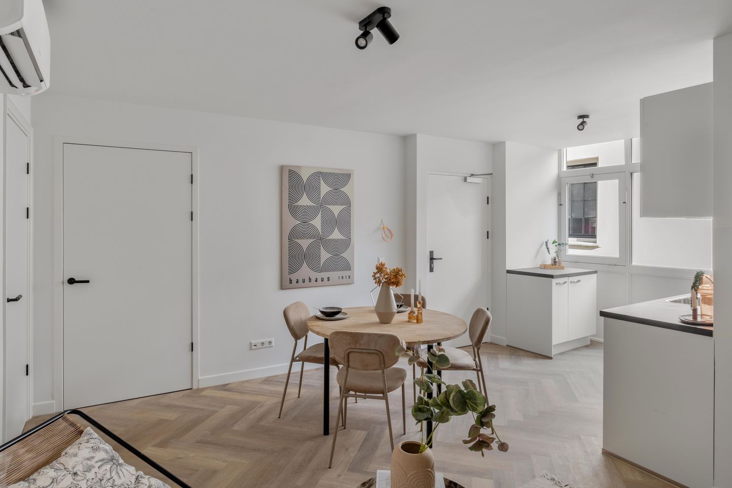 Woonkamer van ca. 21 m² welke zoals het gehele appartement is voorzien van een visgraat PVC-vloer, glad gestuukte wanden en plafonds en wit gesausde wanden en plafonds! Kwestie van meubels neerzetten en lekker wonen! De open keuken is gesitueerd aan de voorzijde van het appartement en bestaat uit een modern keukenblok in rechte opstelling met een ingebouwde combi-oven/magnetron, inductiekookplaat, afzuigkap en vaatwasser. Vanuit de woonkamer toegang tot een ruime bergkast welke is gesitueerd onder het trappenhuis. De slaapkamer van ca. 9 m² is gesitueerd aan de achterzijde van het appartement en beschikt over een badkamer-en-suite. Deze moderne badkamer is geheel betegeld en beschikt over een wastafel, een inloopdouche met regen- en handdouche en mechanische ventilatie. Vanuit de woonkamer tevens toegang naar de bijkeuken/wasruimte met aansluiting voor de wasmachine en opstelling van de elektrische boiler. Vanuit deze ruimte toegang naar de geheel betegelde toiletruimte welke is voorzien van een hangend toilet en een fonteintje.