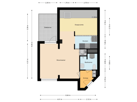 De entree/hal geeft toegang tot de badkamer en de woonkamer. De ruime badkamer is uitgerust met een inloopdouche, wastafel, staand toilet en aansluiting voor de wasmachine. De lichte woonkamer biedt toegang tot het heerlijke dakterras op het zuidoosten, waar je de middagzon volop meepakt. Aangrenzend bevindt zich de eenvoudige, gesloten keuken met losse apparatuur. De ruime slaaphoek is momenteel open, maar kan desgewenst eenvoudig worden afgesloten. Het appartement is voorzien van een nette laminaatvloer, beschikt over (recent vernieuwd) HR++ glas en het schilderwerk buitenom is recent uitgevoerd.