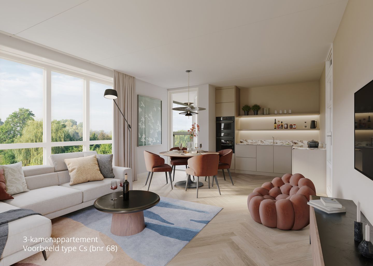 Deze 3-kamerappartementen vind je verspreid over het hele gebouw en zijn er in 3 types: A, B en C. Ze bevinden zich op de begane grond, de eerste en tweede verdieping, evenals de hogere verdiepingen 7 tot en met 10.