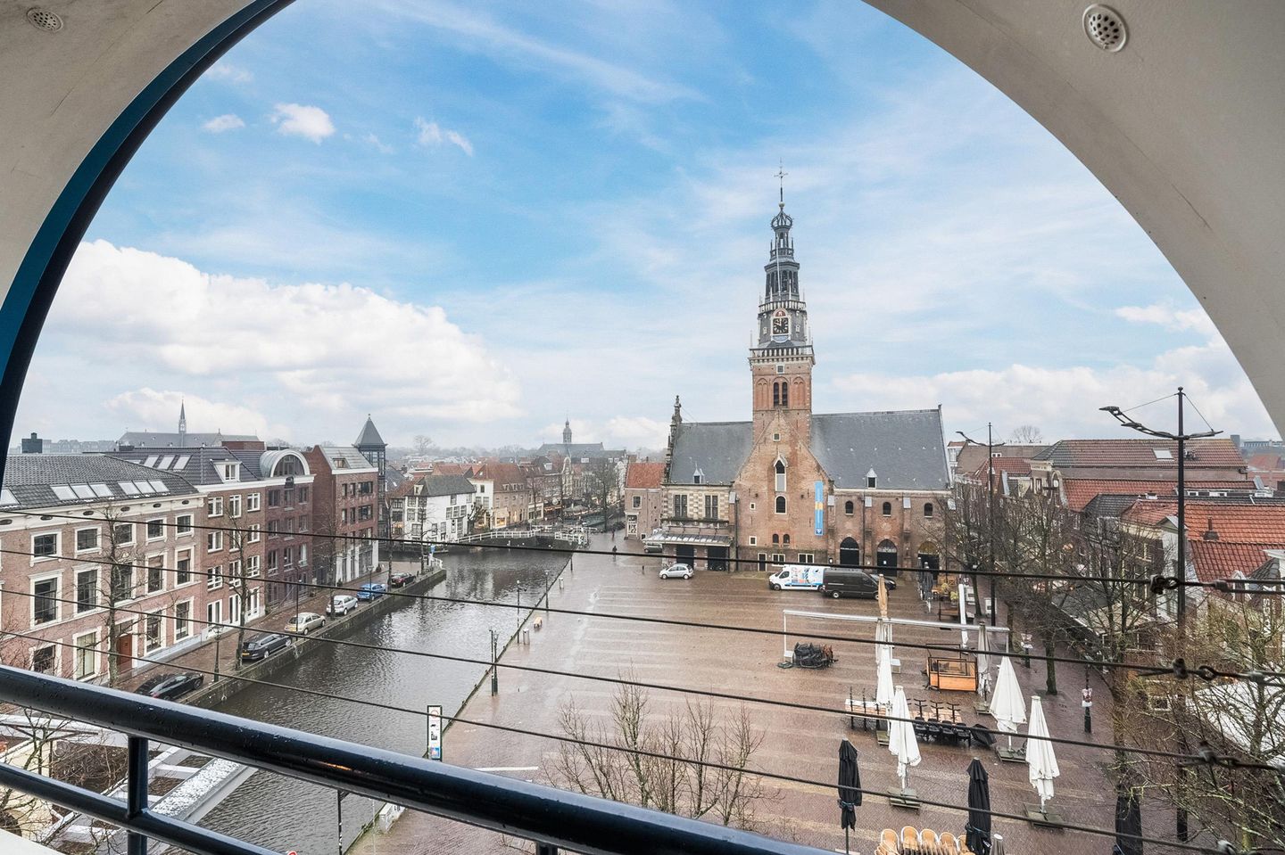 Door de sfeervolle boogramen kijk je recht op het Waagplein wat direct aan je voeten ligt maar dan met het hoogste uitzicht waar je niet alleen een ruim overzicht hebt over de Waagtoren en daken van de Alkmaarse binnenstad, maar ook alle 5 kerken in de buurt kan zien. Ook niet te vergeten de pracht van bootjes welke langs je heen varen in de onderliggende gracht aan de Voordam met al zijn karakteristieke panden.