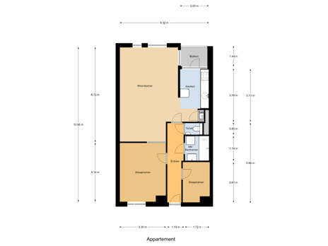 Via de entree komt u in de ruime hal die toegang geeft tot alle vertrekken. De woning beschikt over twee slaapkamers aan de rustige galerijzijde. Door de breedte van het appartement (6.32 mtr.) is hierdoor een heerlijke, lichte en ruime living ontstaan.