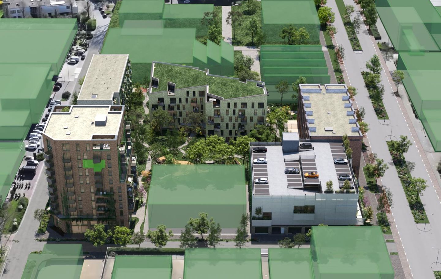 In het zesde blok op de hoek is de parking gelegen. De inrit van de parking ligt aan de Louis Pasteurstraat. Er zijn in totaal 177 parkeerplaatsen aanwezig voor de bewoners, bezoekers en werkruimten. De parking is afgesloten en alleen toegankelijk via een beveiligd parkeersysteem, zodat jouw auto veilig en droog staat. In de parking is er de mogelijkheid tot het kopen van een eigen parkeerplaats.