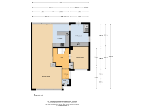 Onder de overkapping bevindt zich de entree naar het voorportaal met toegang tot het moderne toilet. Deze is voorzien van een hangend closet en een wastafeltje. Vervolgens entree in de ruime vestibule met de trapopgang naar de tweede verdieping, de meterkast en toegang tot de woonkamer en de werk-/praktijkruimte. Doordat de garage is opgeheven is deze werk-/hobbykamer ontstaan. De fraaie eikenhouten vloer loopt hier door, waardoor het een mooi geheel vormt met de rest van de begane grondvloer.