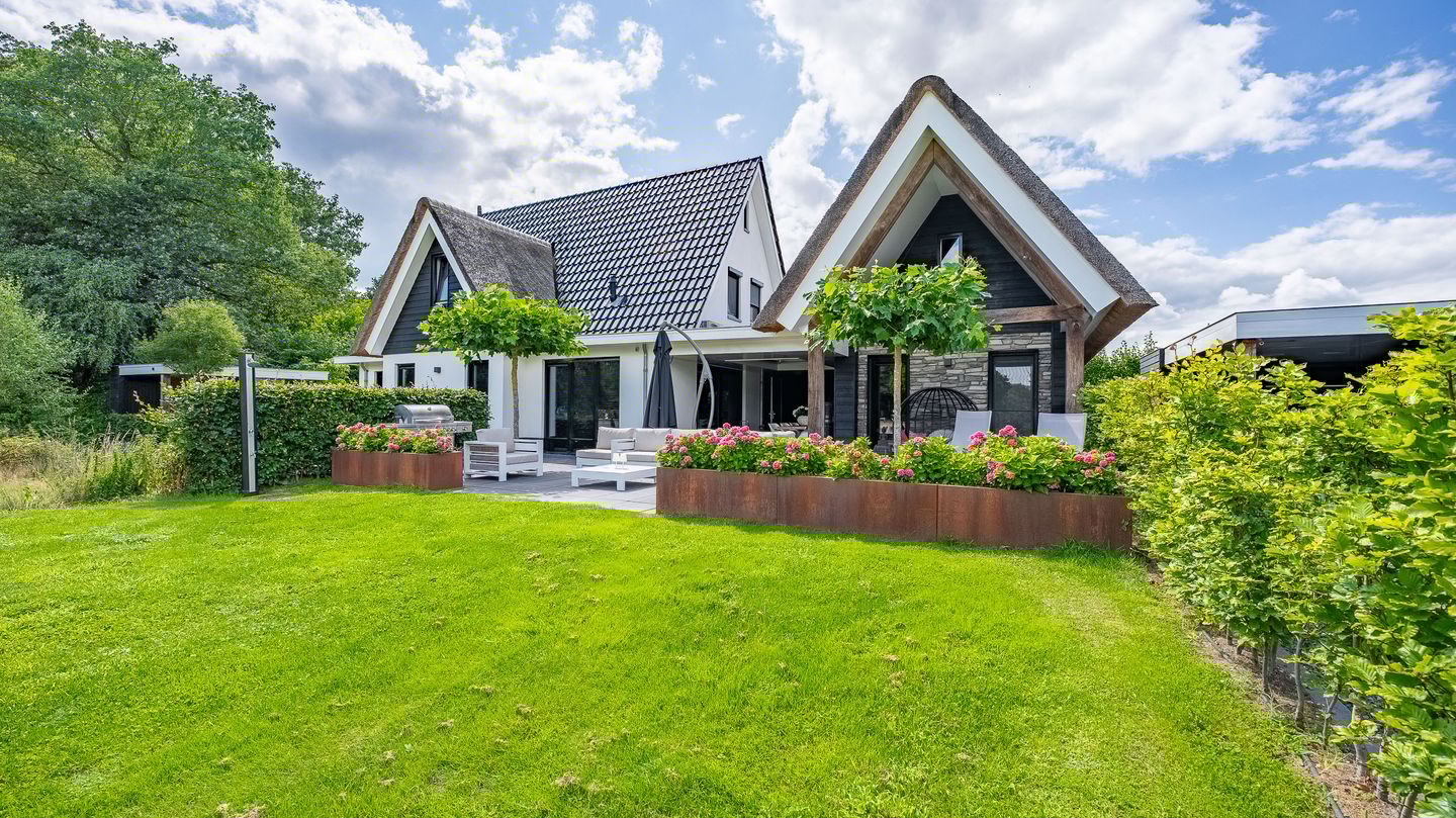 In dit hoogwaardig afgewerkte huis zijn alle woonwensen van de huidige bewoners verenigd. Om te beginnen een strakke, moderne bouwstijl met luxe details als riet-gedekte kappen. Niet alleen de buitenkant is onder architectuur ontworpen, dit geldt ook voor de binnenkant/het interieur. Daarnaast was een woonwens véél leefruimte (de villa beschikt over 213 m² woonruimte) zodat je met veel mensen samen kunt zijn, maar door de verschillende woonruimtes ook lekker even van een momentje voor jezelf kunt genieten. Een centraal gelegen en zeer complete woonkeuken die binnen en buiten op een fantastische manier met elkaar combineert. De volgende features stonden ook hoog op het wensenlijstje: twee livings, luxe slapen en baden op de begane grond, dubbele carport met schuur en overkapping en veel daglichtinval. Verder noemen we hier een kantoorruimte, een inloopkast, een extra overkapping uitkijkend op het groen èn het overdekte terras grenzend aan de woonkeuken. Tenslotte behoorden uitstekende isolatie en handige technische snufjes tot de woonwensen. We nodigen je graag uit om verder te lezen en alles over deze woning te weten te komen. Wie weet mogen we je daarna begroeten tijdens een bezichtiging.