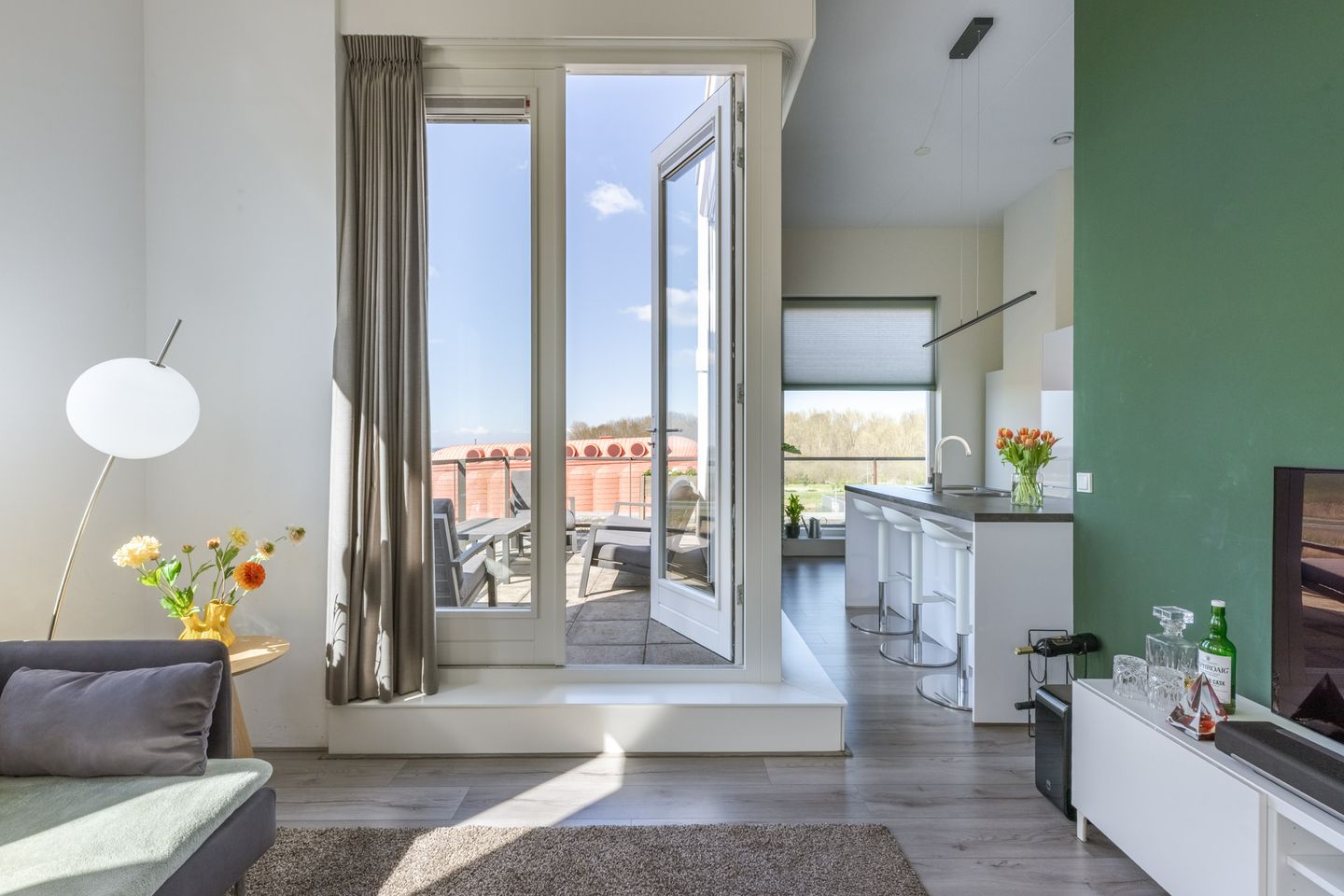 - zeer lichte woonkamer met indrukwekkend grote glaspartij v.v. airco (2019) Via een dubbele openslaande deur is er toegang tot het grote dakterras (ca. 20m2), gelegen op het zuidwesten en met uitzicht richting o.a. Pampus en Amsterdam. Op het dakterras is er als zonwering een elektrisch zonnescherm geplaatst