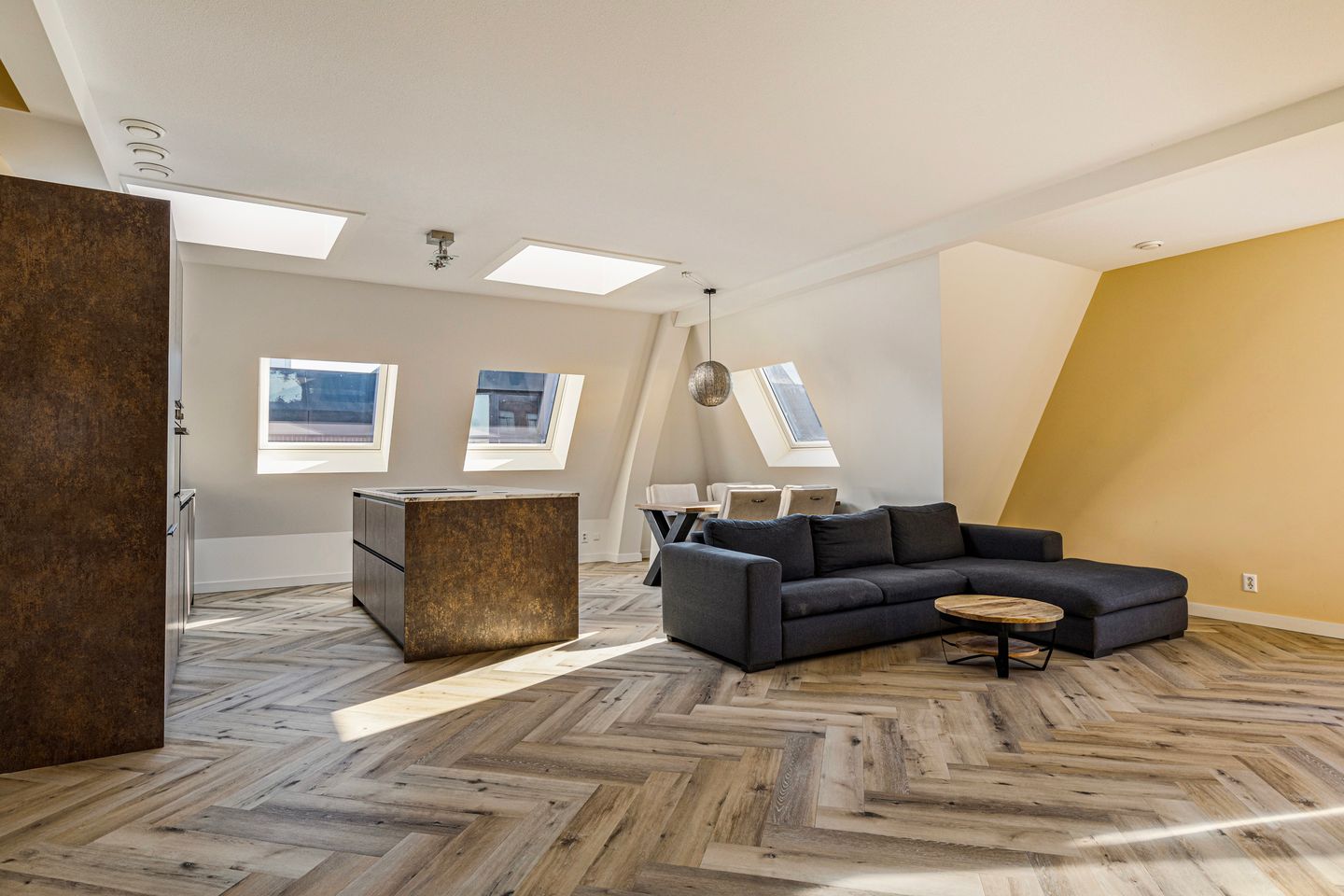 De woonkamer is royaal opgezet en profiteert van een fijne lichtinval door meerdere speels geplaatste dakramen. Hier creëer je met gemak een sfeervolle zithoek en een comfortabele eethoek. De ruimte loopt moeiteloos over in de luxe open keuken, met kookeiland en hoogwaardige apparatuur, waaronder een inductiekookplaat met geïntegreerde afzuiging, vaatwasser, combi-oven, koel-/vriescombinatie en een Quooker – allemaal keurig weggewerkt in stijlvolle kasten met een bronskleurige metallic uitstraling en marmerlook werkbladen. Er is tevens een praktische inpandige berging met aansluitingen voor wasmachine en droger, én plek voor extra opslag.