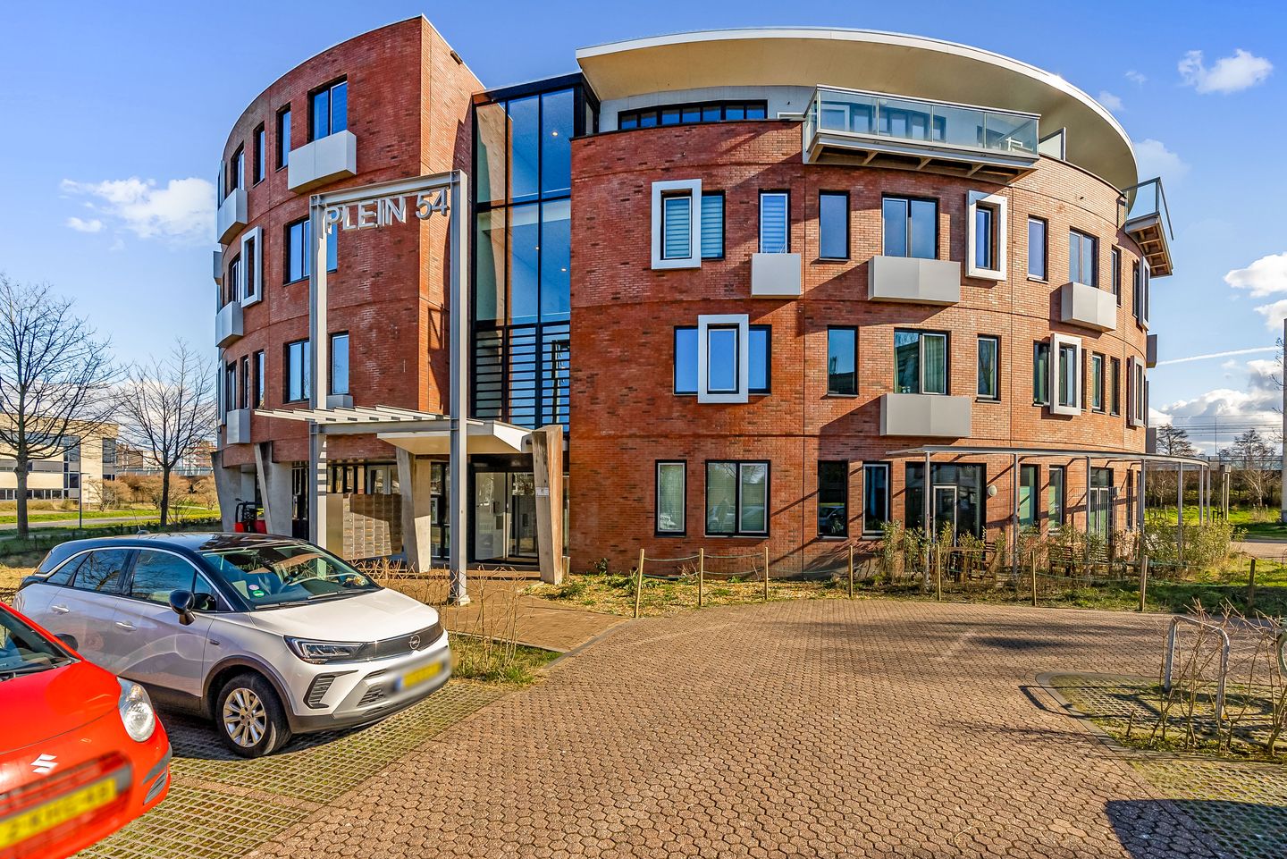 The Plein 54 apartment complex has a distinctive round shape, creating a playful and open atmosphere that enhances the living experience. On the ground floor, there is a large communal space where residents can gather for coffee or organize activities. The shared rooftop garden is a great place to relax and enjoy the view.