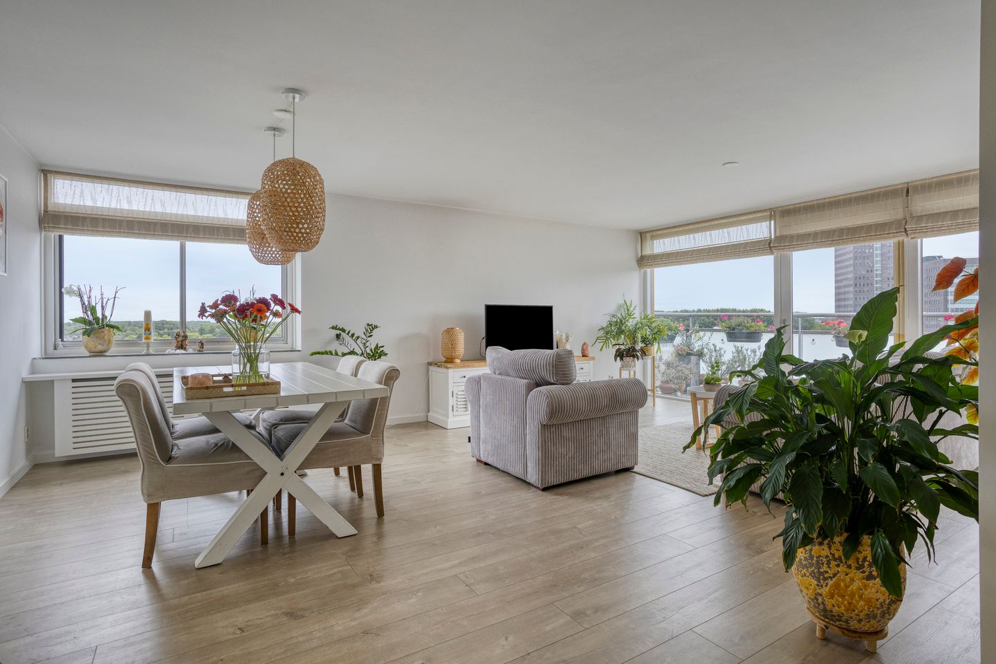 Indeling achtste (bovenste) verdieping: - Welkom in de lichte hal met toilet, garderobe en ruime berging met wasmachine-/droger aansluiting. In de hal bevind zich ook de video intercom welke extra veiligheid biedt. De royale woonkamer heeft grote raampartijen voor heerlijk veel daglicht. Kenmerkend voor dit appartement is het prachtige weidse uitzicht vanuit de woonkamer en het balkon. Luxe keuken in het hart van het huis, uitgerust met o.a. een granieten aanrechtblad, koel/vriescombinatie, vaatwasser, combi-magnetron, oven, inductiekookplaat, afzuigkap en Quooker. Ruim balkon met veel privacy en rust door de topligging en een prachtig weids uitzicht. Tevens heeft u vanuit uw balkon zicht op uw eigen privé parkeerplaats en een naast gelegen park.