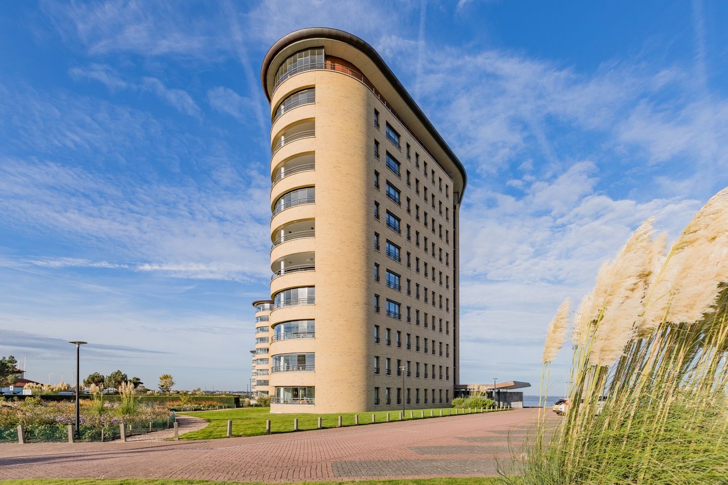 Via de trap of lift, 2e woonlaag, smaakvolle hal, voordeur naar het appartement. Entree, garderobekast en hal welke toegang geeft tot de drie slaapkamers, twee badkamers, ruime living met terras, keuken en laundry. De living is riant te noemen en via de schuifpui van de woonkamer is toegang tot het volledig afsluitbare terras met harmonica ramen. De living is uniek gelegen op de kop van het onder architectuur ontworpen pand en geeft hier mee aan alle kanten zicht op het water en unieke zonsondergangen vanaf het terras van maar liefst 19m². Tevens geeft de vorm van de woonkamer een zeer prettige sfeer en veel licht.