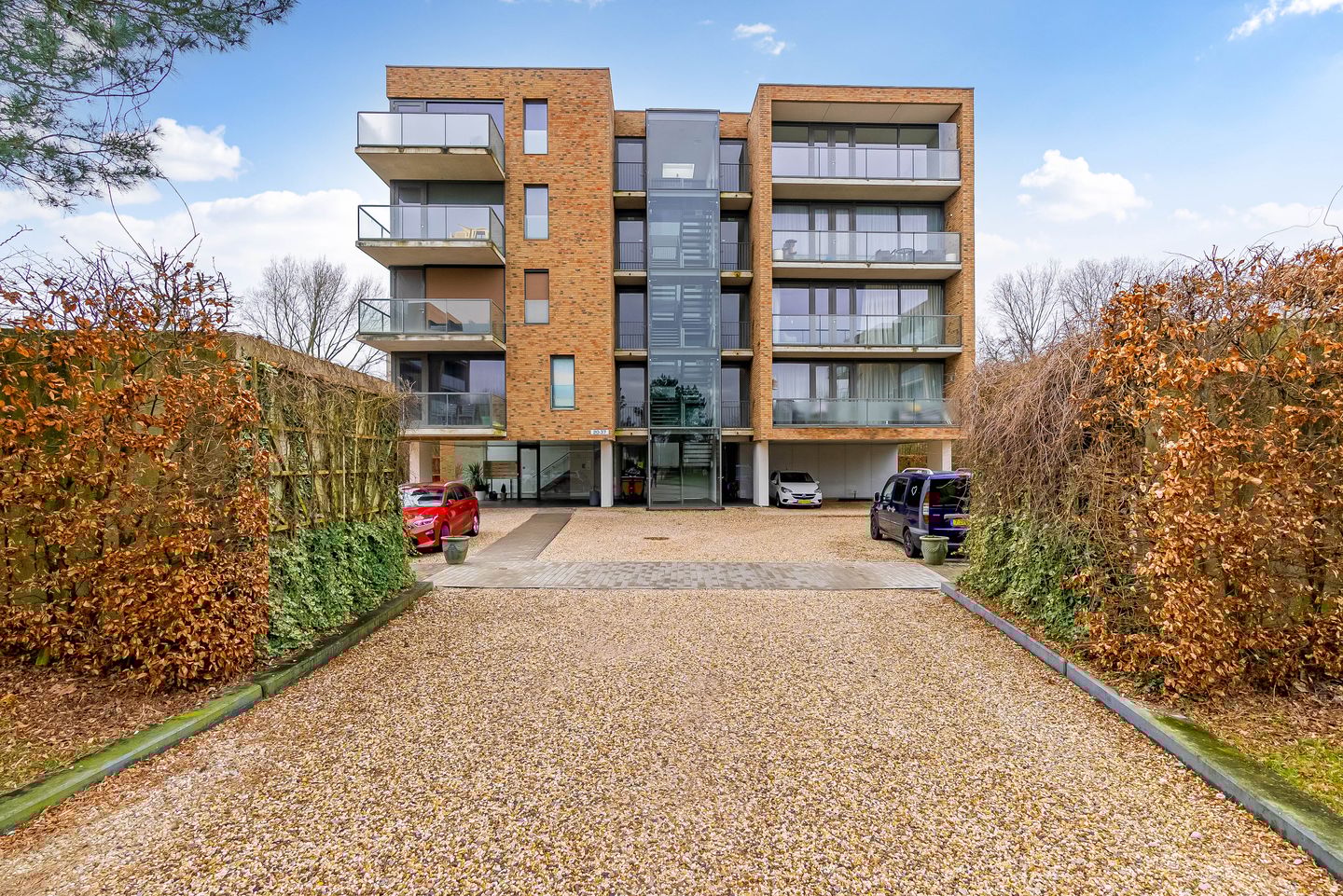 Entree met brievenbussen, lift, trapopgang en toegang tot de eigen berging en parkeerplaats.