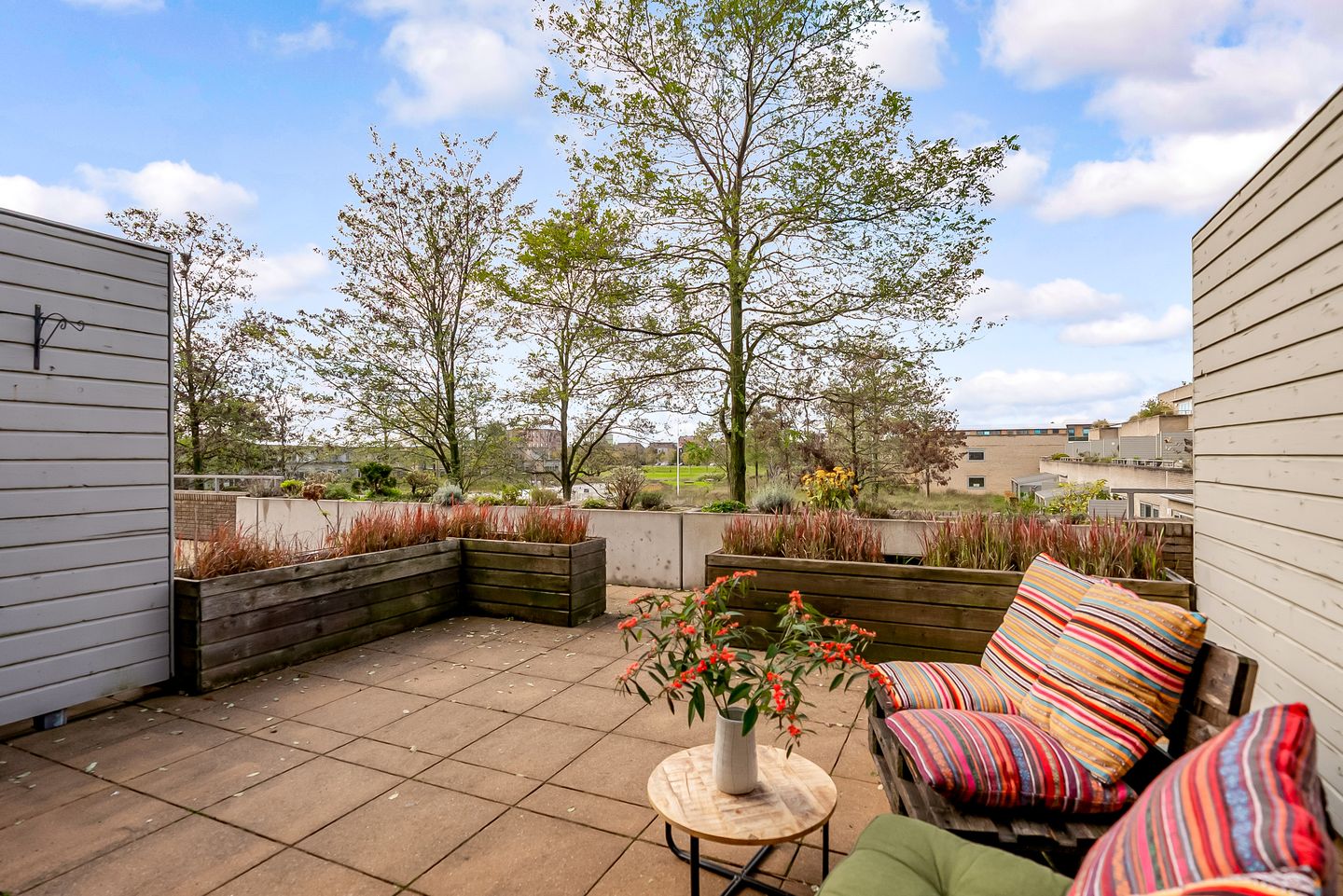Je eigen, royale terras van 31 m2 ligt voor je voordeur met uitzicht op de binnentuin en zwembad.