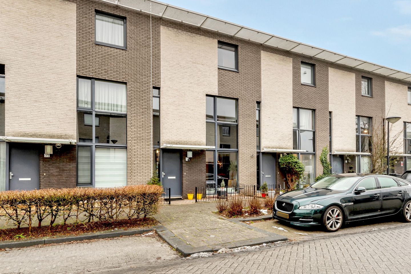 De voortuin is geheel bestraat en meet zo’n 8½ m².