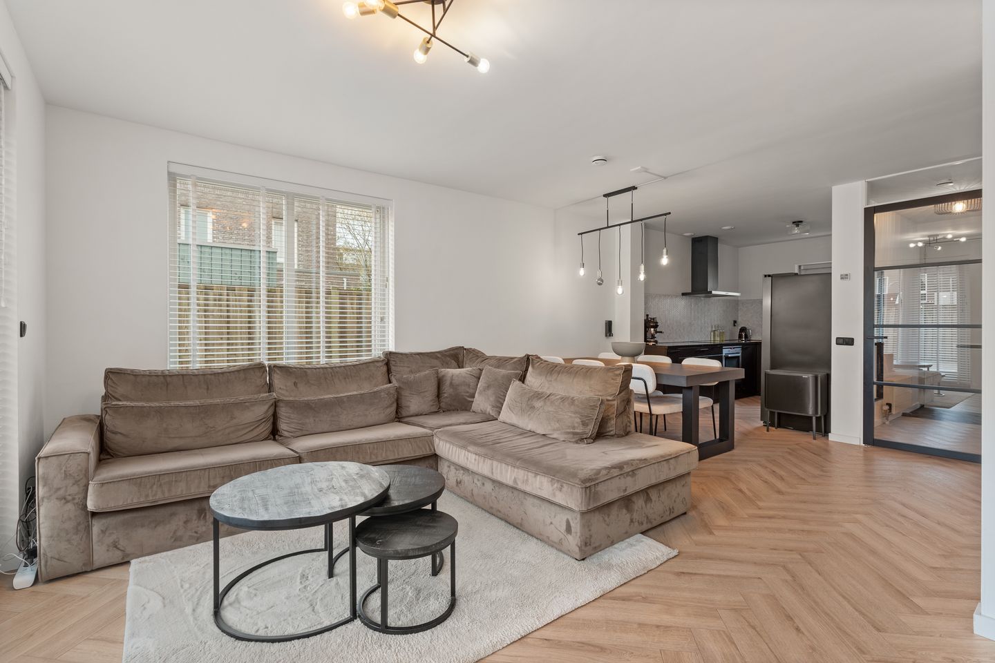 Door een juiste afstemming van kleuren en materialen is de woonkamer een heerlijke ruimte om te vertoeven. De vloer is belegd met een visgraat laminaatvloer (2020), er zijn wit hoge plinten geplaatst en de wanden en het plafond zijn strak afgewerkt. De openslaande deuren aan de achterzijde zorgen voor een perfecte interactie tussen woonkamer en tuin. Verder is er een trapkast aanwezig, ideaal voor het opbergen en bewaren van spullen.