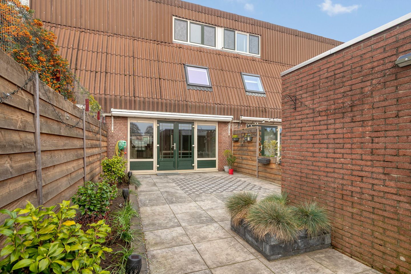 De netjes aangelegde achtertuin op het zuidoosten biedt volop zonuren. U vindt hier een ruim terras, groen in de vaste bloembak, houten schuttingen en een stenen berging. Via de achterom bereikt u het achtergelegen plantsoen met parkeerplaatsen. Ook de voortuin is keurig verzorgd.
