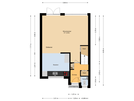 Je komt binnen via de voortuin, waar je in de ochtendzon heerlijk van een kop koffie kunt genieten. Achter de voordeur vind je een hal met het toilet, de trap naar boven en toegang tot de leefruimte.