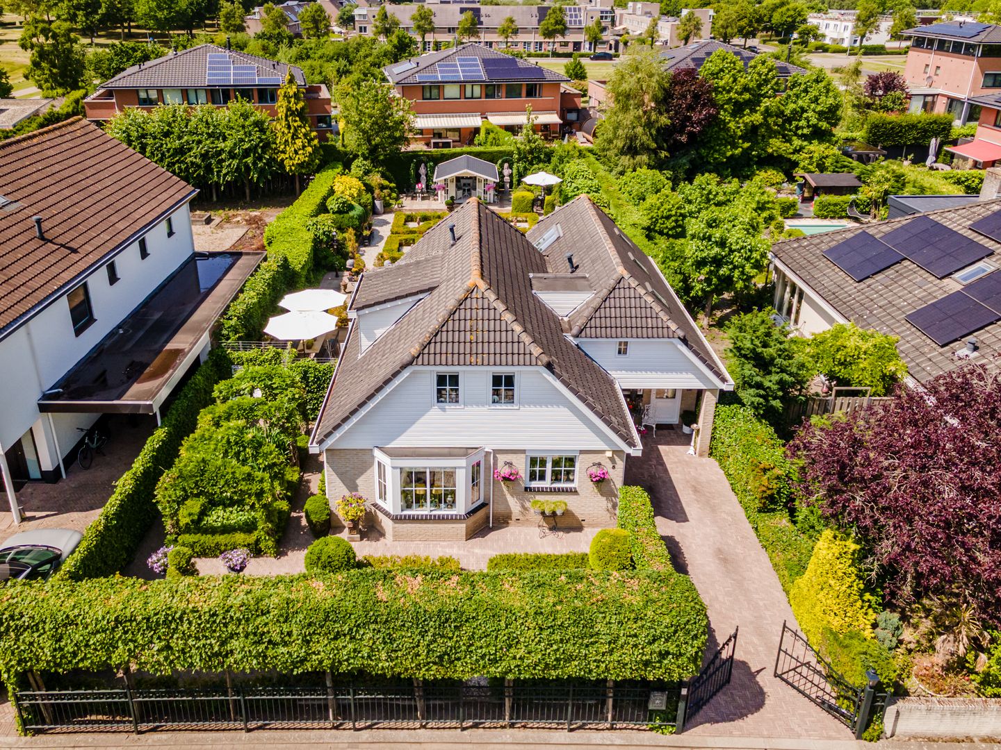 - Voortuin met oprit voor meerdere auto’s welke afgesloten kan worden met een sierhekwerk