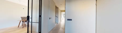Bij binnenkomst in de woning valt direct de hoogte van het plafond op en zie je hoe strak en modern de afwerking is. De lichte kleuren op de wanden, de hoogwaardige materialen en de rustige uitstraling zorgen ervoor dat je je hier meteen thuis voelt. Op de vloer ligt een prachtige, houten visgraat parketvloer, die ook in de rest van de woning doorgetrokken is. Extra fijn: alle ruimtes op de begane grond en beide badkamers hebben vloerverwarming. In de hal vind je de meterkast met de hoofdunit voor de stadsverwarming en glasvezel, het separaat toilet met fonteintje, een handige trapkast en een aparte waskamer met ruimte voor zowel de wasmachine als droger.