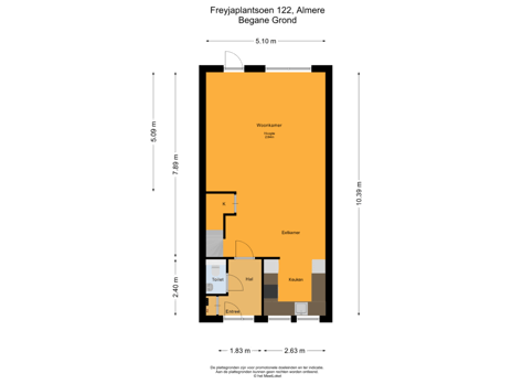 - 91 m² (16,90 meter diep en 5,40 meter breed)