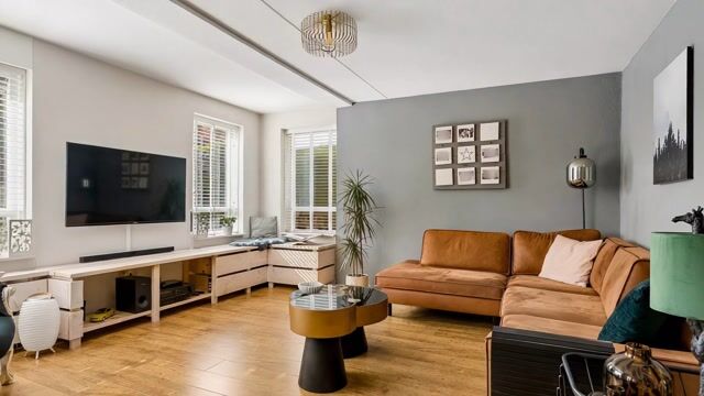 Wanneer u de woonkamer binnenloopt valt direct op hoe licht en ruim deze is. Grote raampartijen zorgen voor een prettige lichtinval en een open sfeer.